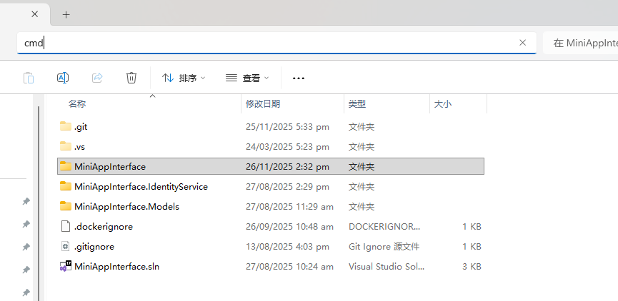 访问文件的根目录,执行cmd。然后准备打包指令。注意的是如果是分层架构项目一点要注意Dockerfile的相对路径位置。确认无误后执行docker build -t指令,后面第一个参数是打包后的镜像名称,指令最后便是执行打包命令