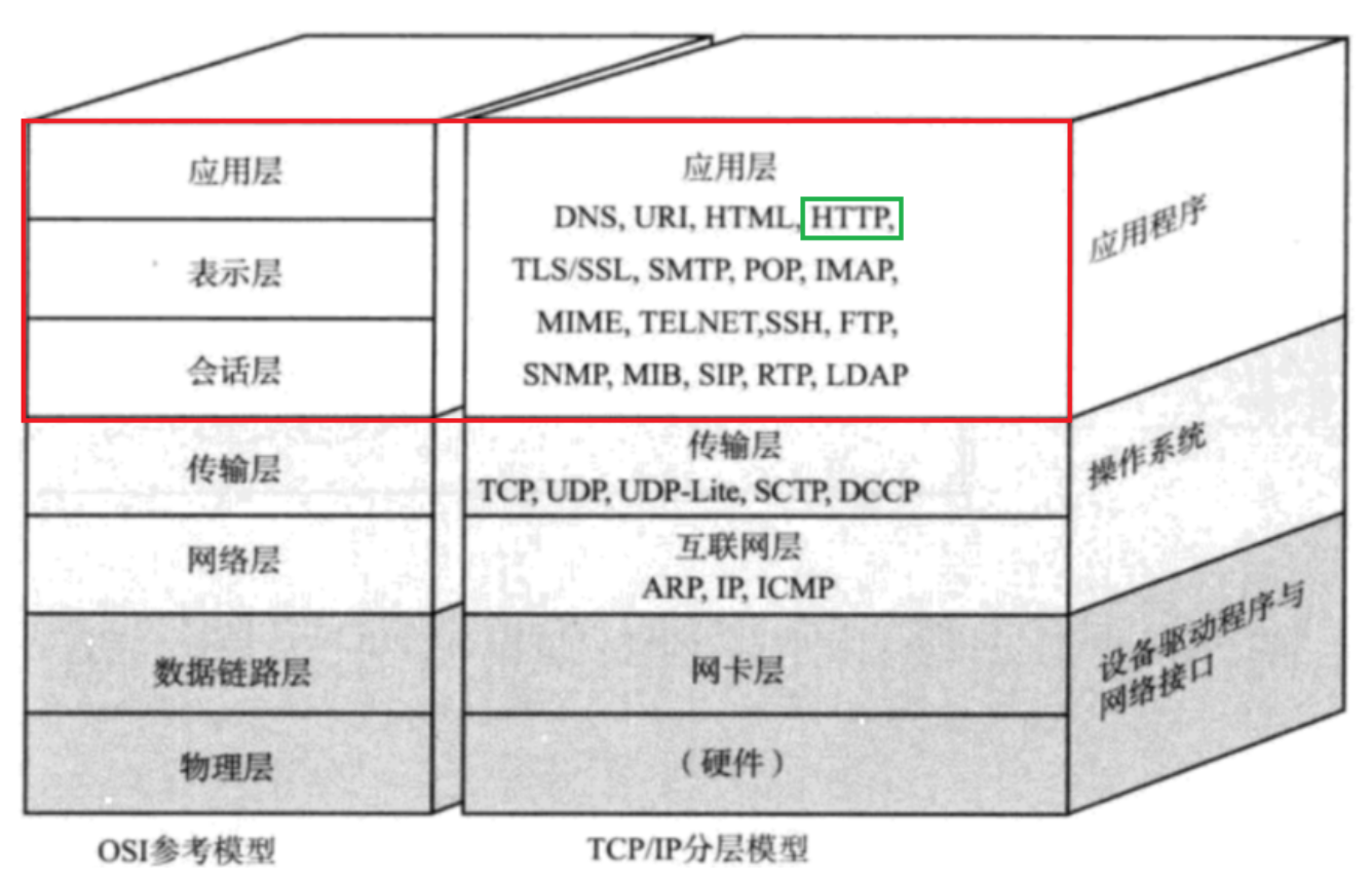 又是这张图,在OSI模型中,网络可以分为七层,而在TCP/IP模型中,网络分为五层,这是将OSI中的上三层,包括会话层,表示层,应用层归为了一层,统称为应用层。