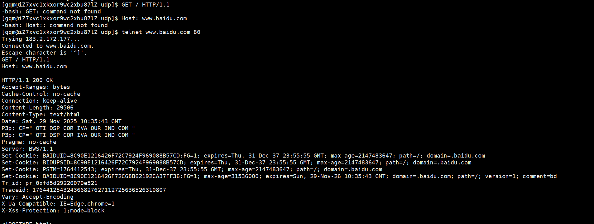 telnet链接一下百度首页,用GET方法获取一下资源:(回车后再回车(空行))