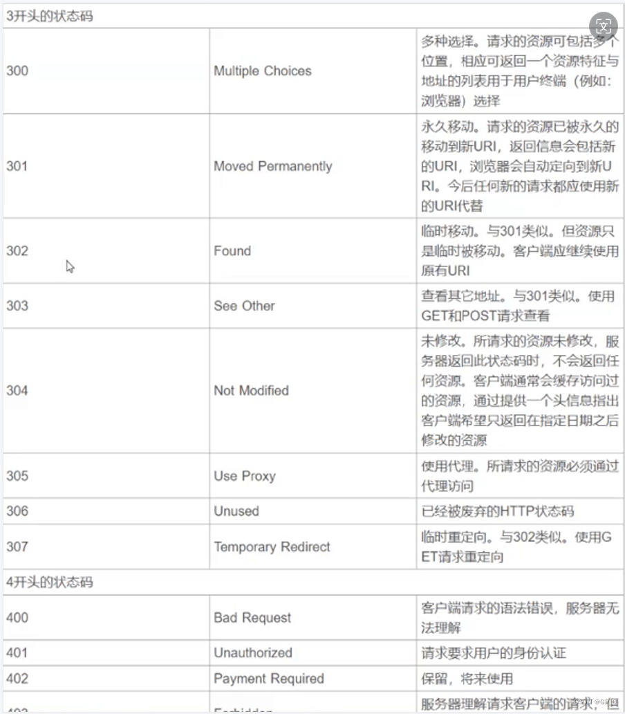 下面重点说一下重定向状态码(3XX), 看下网上的一些表: