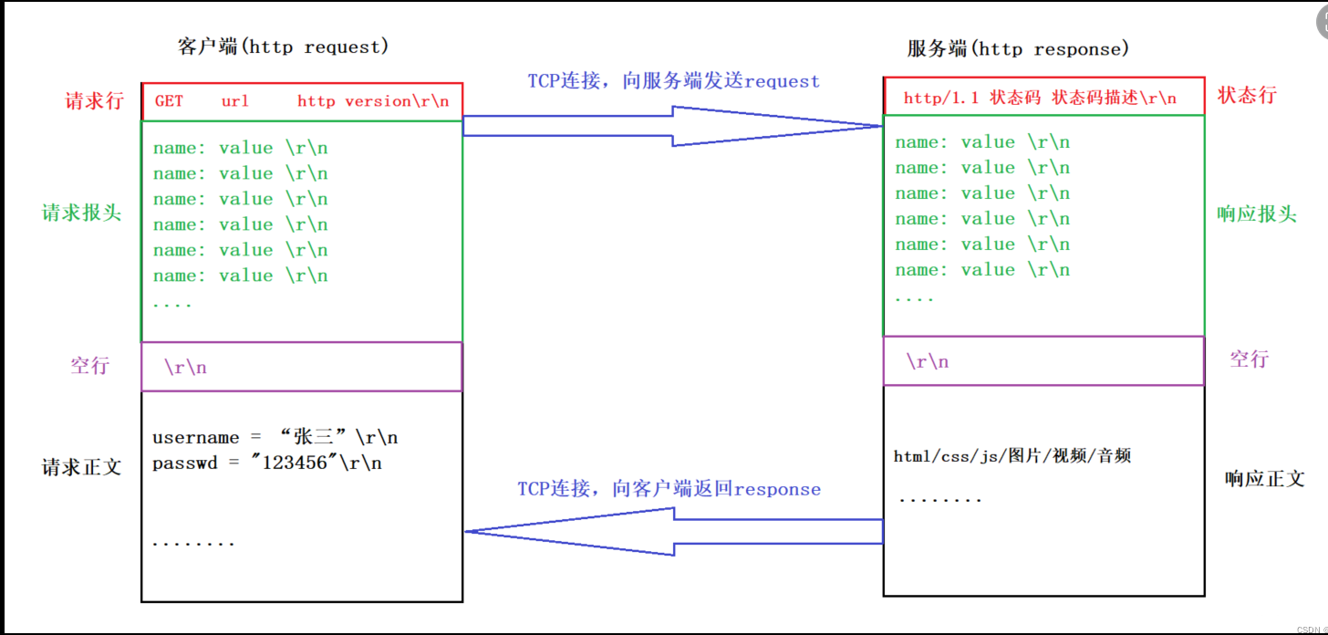 每一部分都是以字符串形式放在报文中,如GET url http/1.0\r\nname: value\r\n\r\n,这一个报文中,包含请求行,一行属性以及空行。