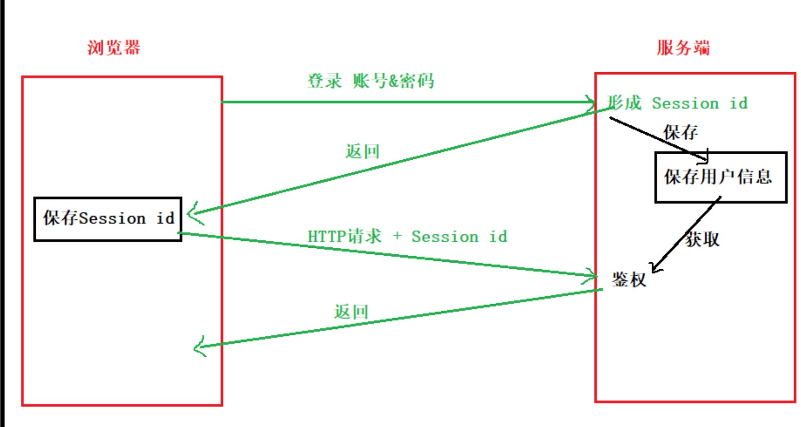 如上图所示,当第一次登录时,浏览器的form表单中的用户信息提交到了服务器,服务器创建Session文件并保存用户信息,然后再生成一个id返回给浏览器。