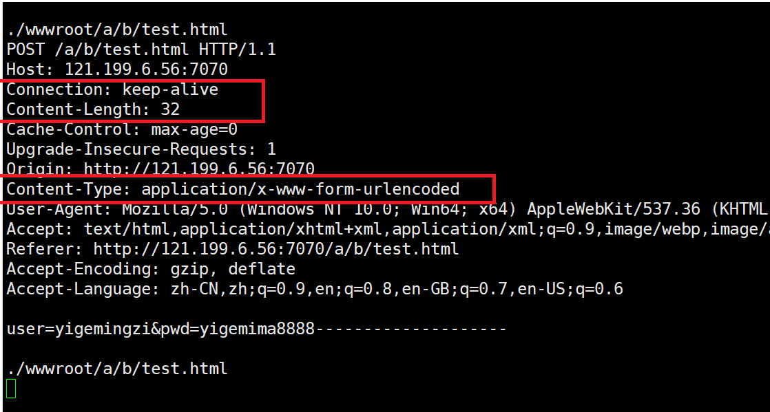 Content-Type: xxx\r\n 表示连接类型,请求和响应中都有。 上图所示的是请求中的Content-Type,由于会用表单提交数据所以它的值如上图红色框中所示。这是浏览器在告诉服务器,它提交的请求类型是form,服务器需要按照表单的处理方式来处理。