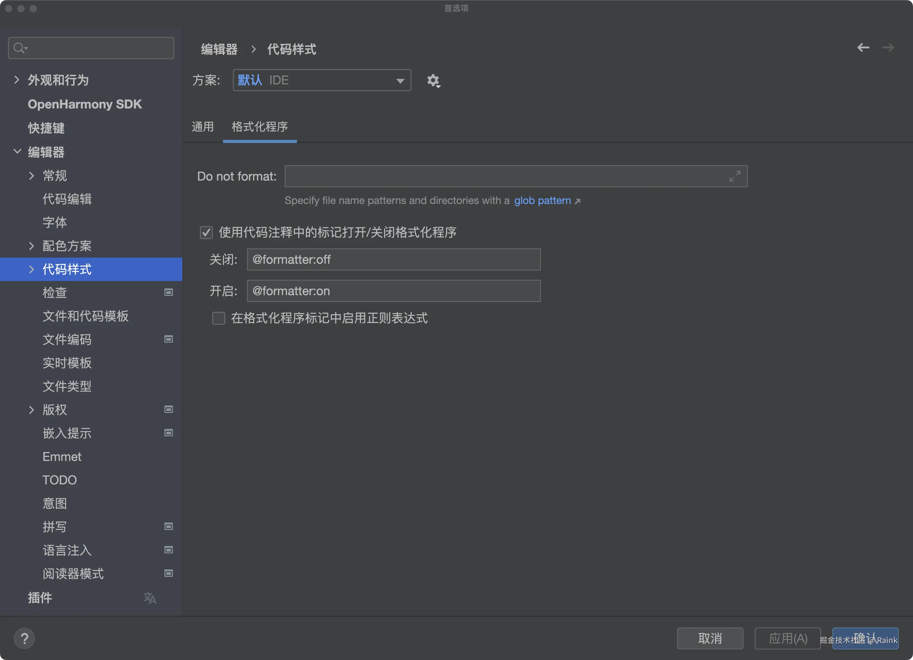 - 在File > Settings >Editor > Code Style (macOS为DevEco Studio > Preferences > Editor > Code Style),单击"Formatter",勾选"Turn formatter on/off with markers in code comments"。如图8所示。