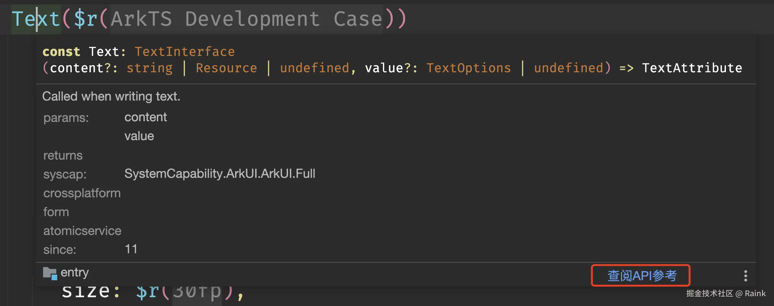 在编辑器中调用ArkTS/JS API或组件时,支持在编辑器中快速、精准调取出对应的参考文档。