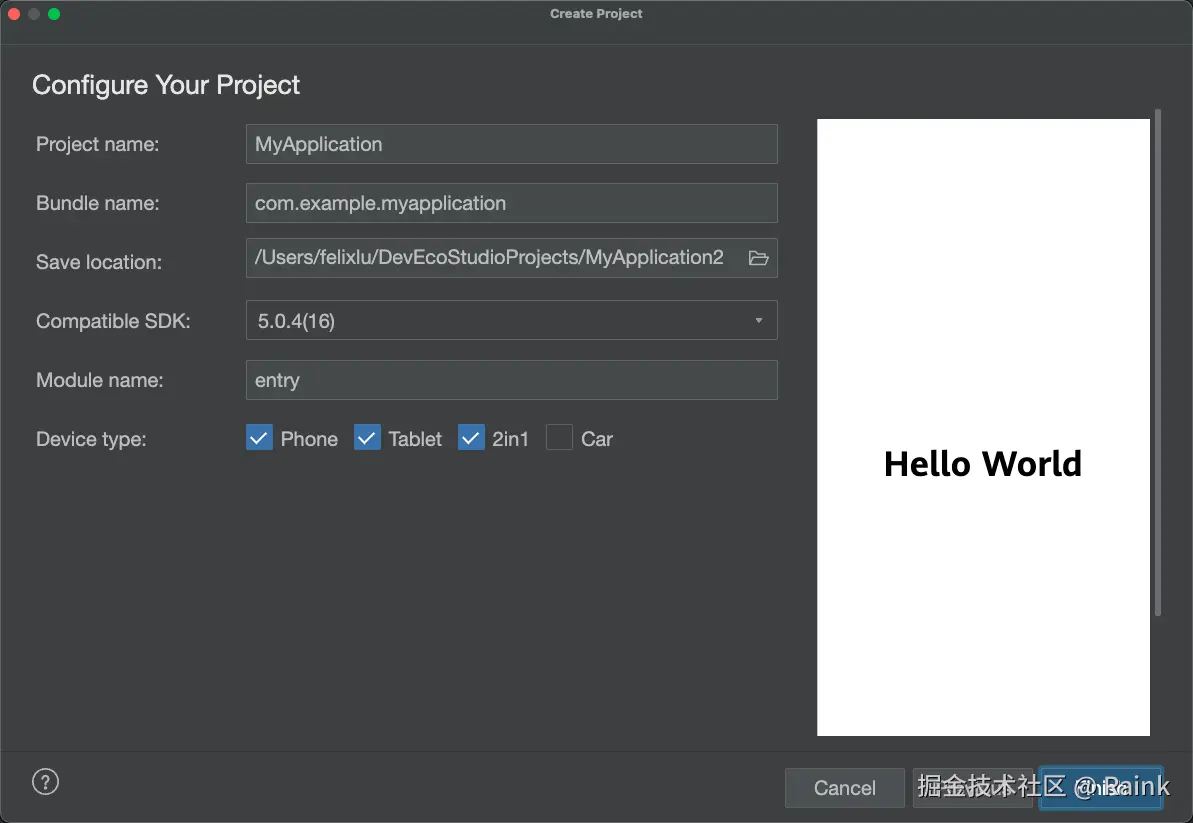 | Native C++ | 用于Phone、Tablet、2in1、Car设备的模板,作为应用调用C++代码的示例工程,界面显示"Hello World"。 |