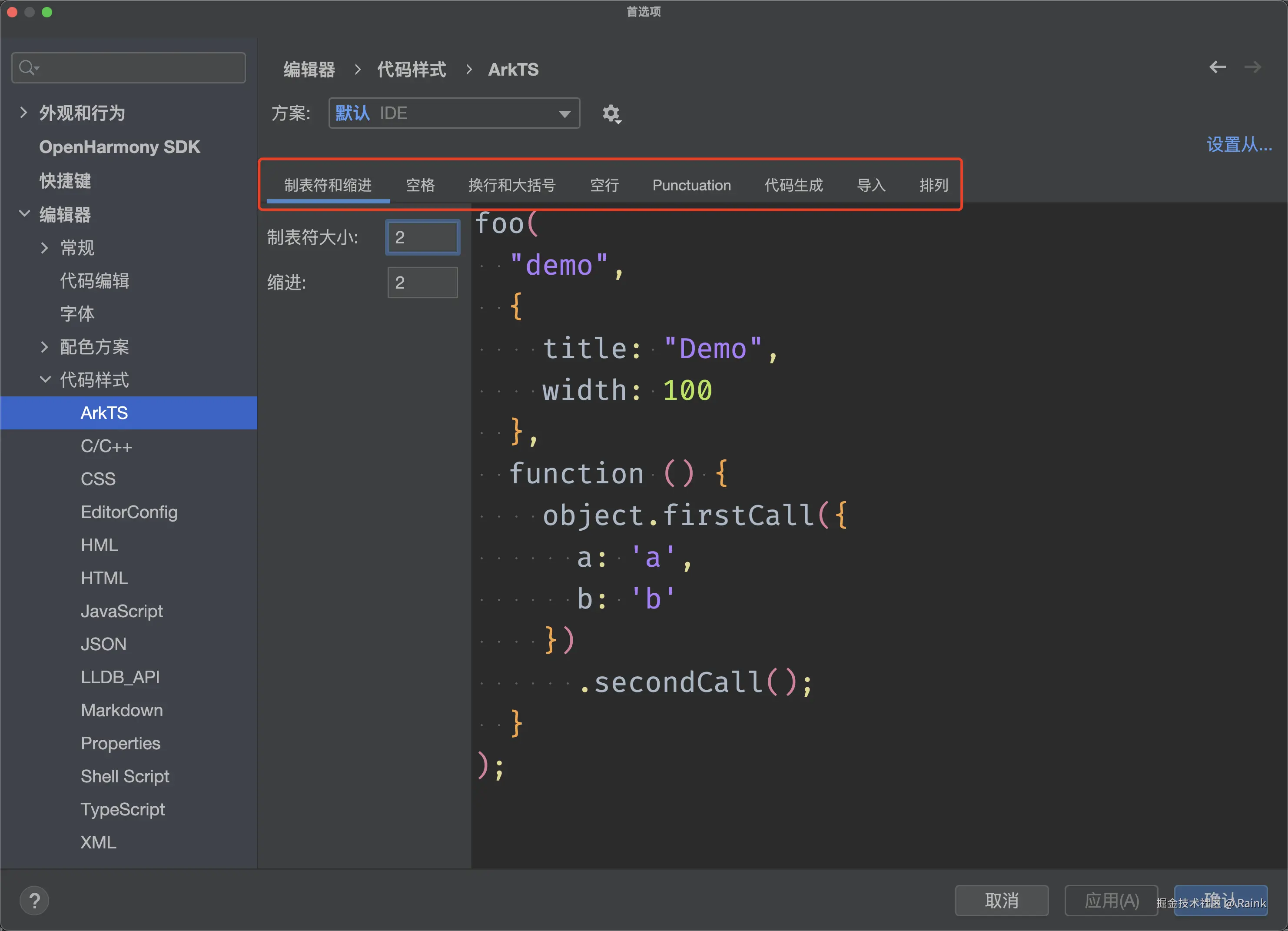 代码格式化功能可以帮助您快速的调整和规范代码格式,提升代码的美观度和可读性。默认情况下,DevEco Studio已预置了代码格式化的规范,您也可以个性化的设置各个文件的格式化规范,设置方式如下:在File > Settings > Editor > Code Style (macOS为DevEco Studio > Preferences > ****Editor ****> ****Code Style)下,选择需要定制的文件类型,如ArkTS,然后自定义格式化规范即可。