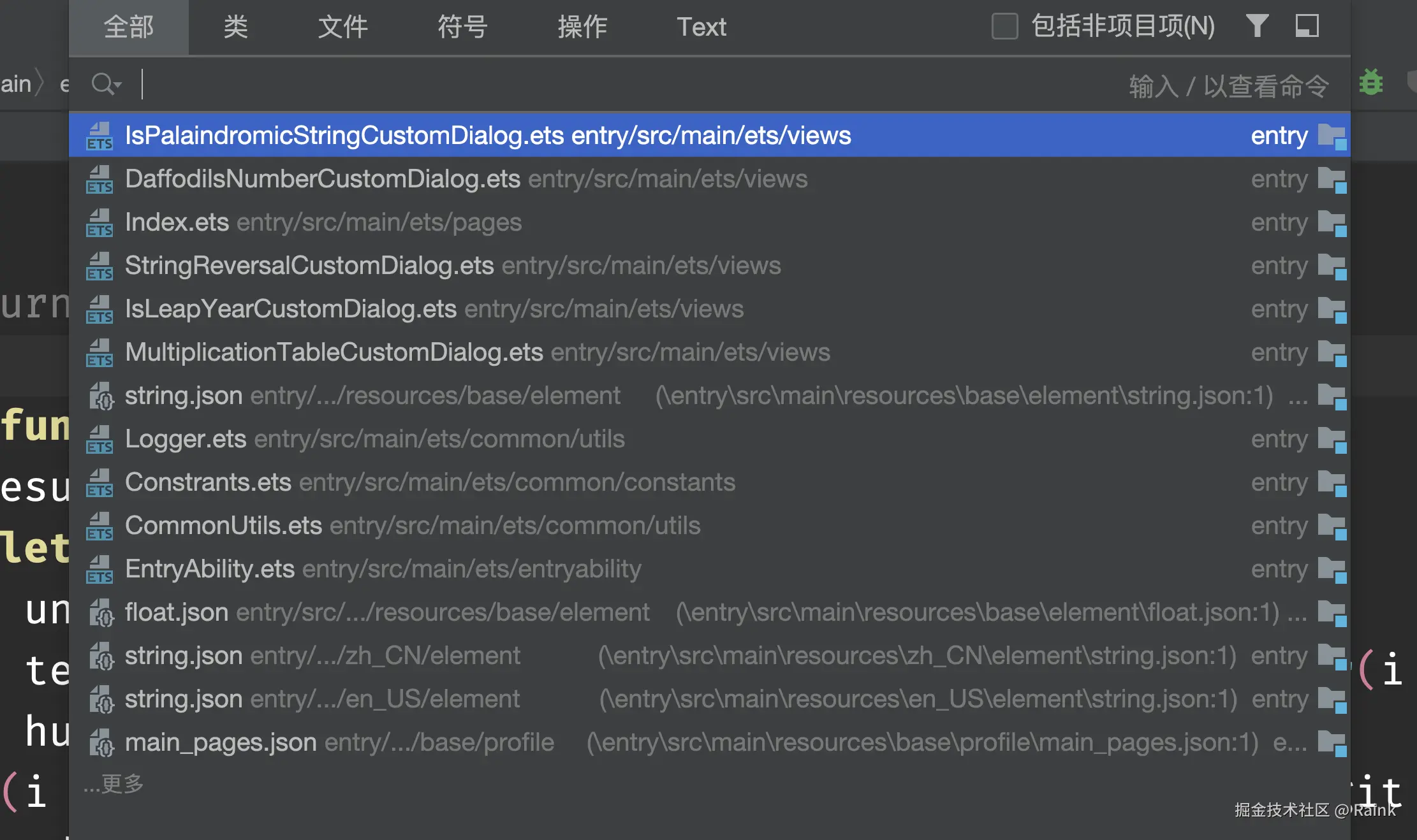 通过对符号、类或文件的即时导航来查找代码。检查调用或类型层次结构,轻松地搜索工程里的所有内容。通过连续点击两次Shift快捷键,打开代码查找界面,在搜索框中输入需要查找内容,下方窗口实时展示搜索结果。双击查找的结果可以快速打开所在文件的位置。如图15所示。