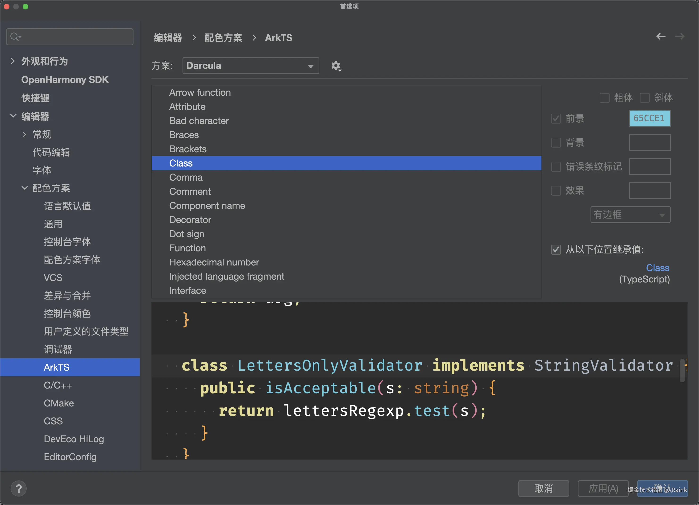 支持对代码关键字、运算符、字符串、类、标识符、注释等进行高亮显示,您可以打开File > Settings (macOS为DevEco Studio > Preferences )面板,在Editor > Color Scheme 自定义各字段的高亮显示颜色 。 默认情况下,您可以在Language Defaults中设置源代码中的各种高亮显示方案,该设置将对所有语言生效;如果您需要针对具体语言的源码高亮显示方案进行定制,可以在左侧边栏选择对应的语言,然后取消"Inherit values from"选项后设置对应的颜色即可。如图6所示。