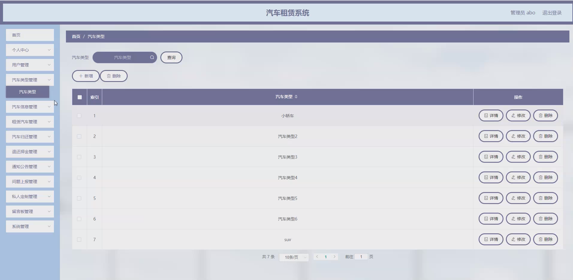系统项目功能:用户,汽车类型,汽车信息,租赁汽车,汽车归还,问题上报,私人定制,退还押金,通知公告