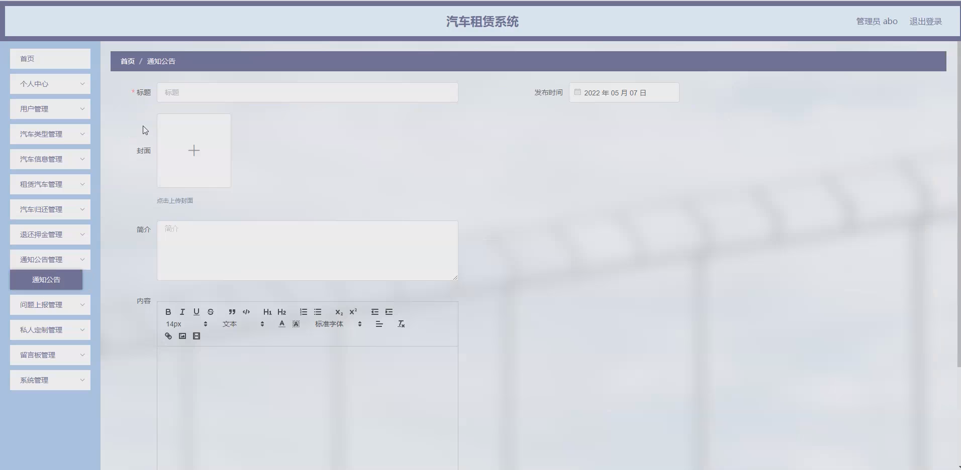 发布企业相关的通知公告信息,如优惠活动、车辆更新通知、服务调整公告等。管理员可添加、编辑、删除通知公告;用户登录系统后可查看最新的通知公告,及时了解企业动态和相关政策。