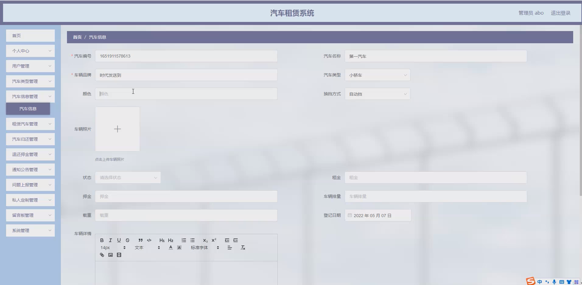 展示汽车的详细信息,包括车辆型号、车牌号、颜色、座位数、燃油类型、租金标准、车辆状态(可租、已租、维修中)等。管理员可添加新车辆信息、更新车辆状态(如车辆出租后将状态改为"已租",归还后改为"可租")、维护车辆维修记录等;用户可查看车辆详情并根据需求进行预订。