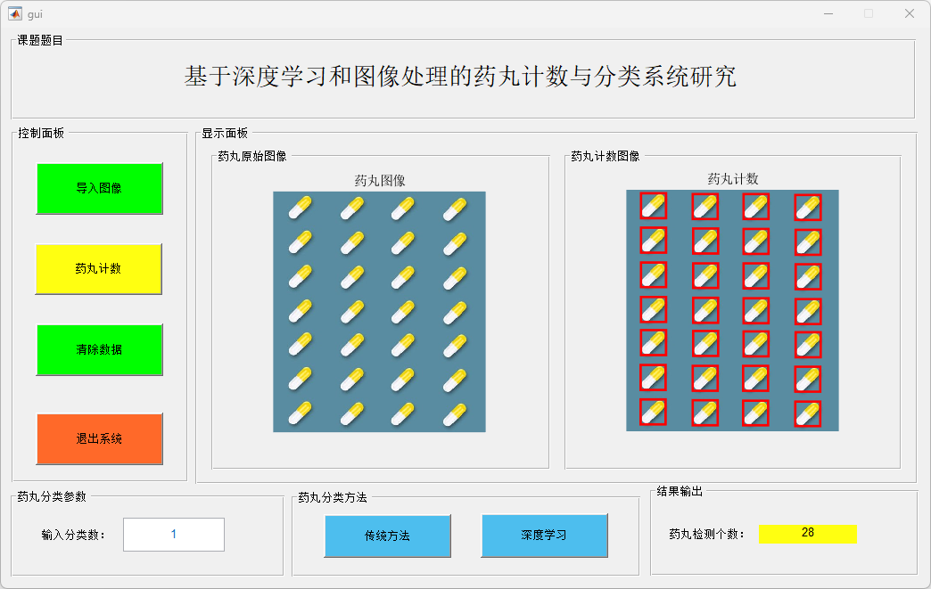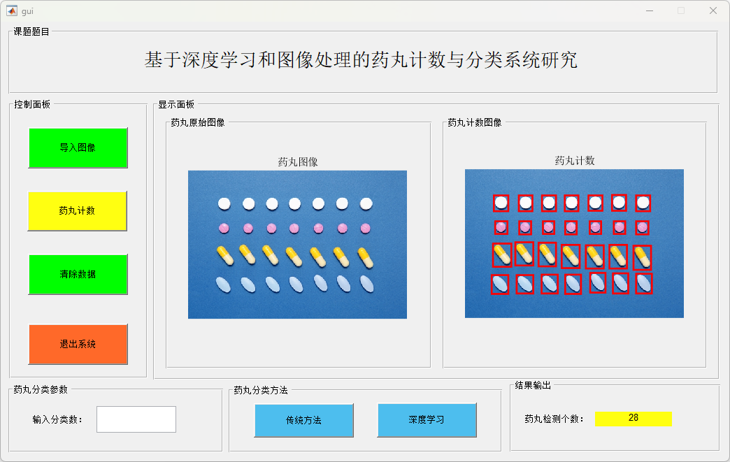 此外,本文基于 MATLAB GUIDE 构建了图形化用户界面,集成图像加载、预处理、药丸分割与显示、计数统计、传统特征分类与深度学习特征分类等功能,实现了系统的可视化操作与便捷调用。实验结果验证了该系统在药丸图像自动处理、数量统计以及基于特征的分类任务中的有效性与实用性。