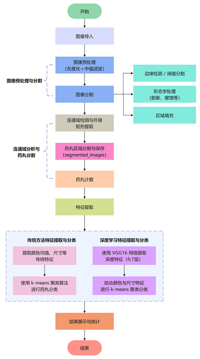 本系统采用"图像预处理+药丸分割计数+特征提取与聚类分类+MATLAB GUI 可视化"的整体架构,实现了药丸图像的自动检测、计数与分类一体化处理。