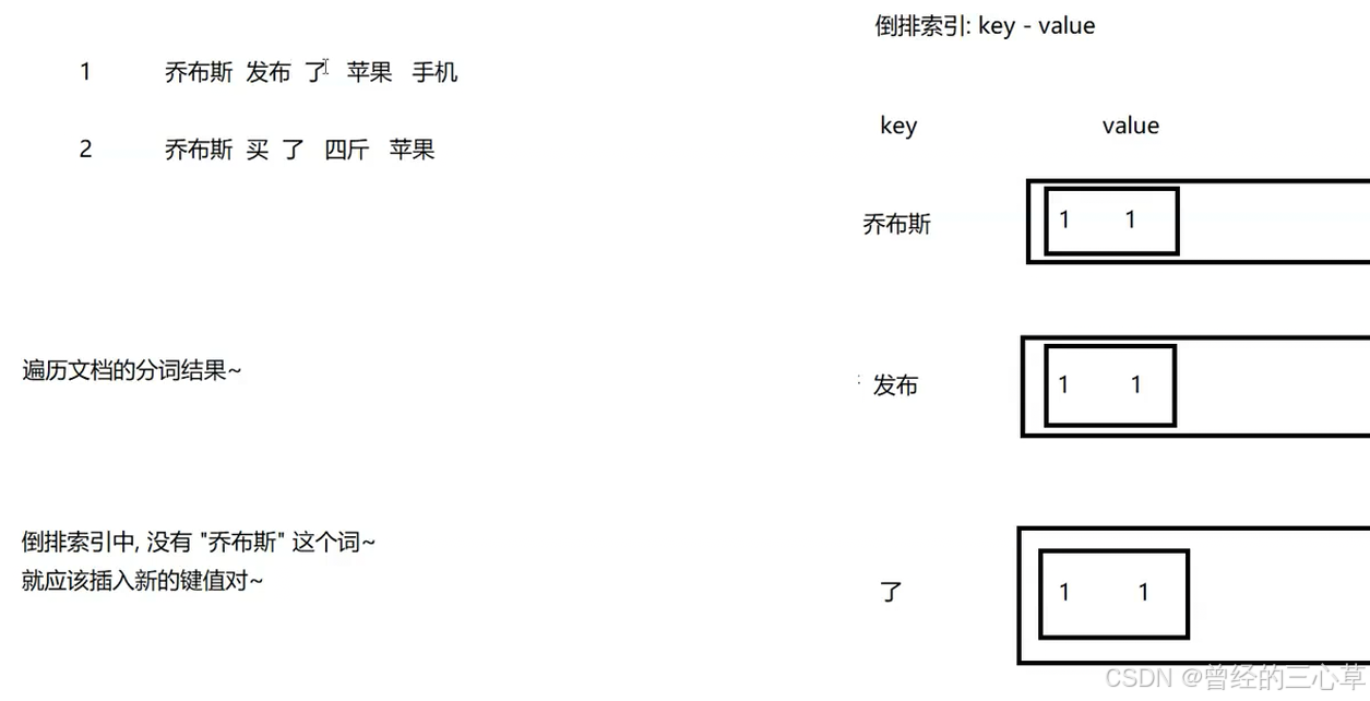 倒排索引是一个键值对结构,key是分词结果,value是和这个分词结果有关的文档id列表