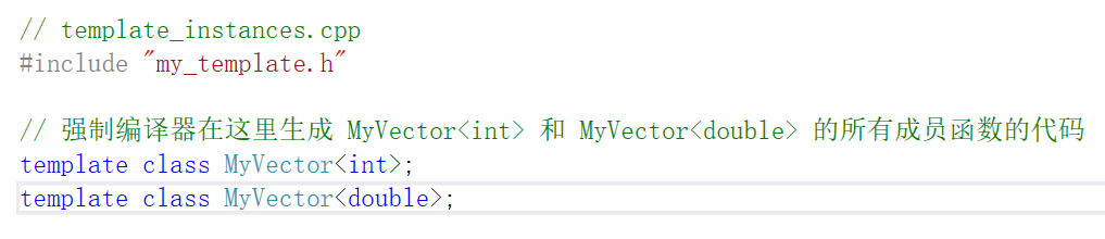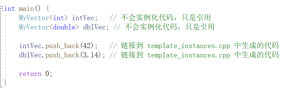 1.隐式实例化: 当你在代码中使用一个模板时(例如 std::vector<int>),编译器会在**当前编译单元(.cpp)**中自动生成该模板的代码。这个过程发生在编译期。