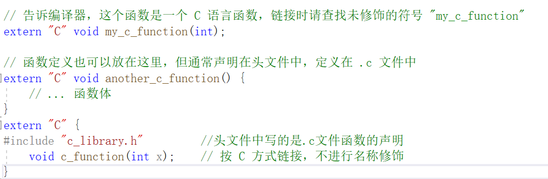 1.extern "C" 的主要作用就是:告诉 C++ 编译器,按照 C 语言的规则来编译和链接被它修饰的代码。