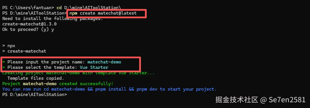 在命令行里,切到你想放项目的文件夹,比如 D:\code,然后用MateChat最新CLI来创建项目,非常方便。