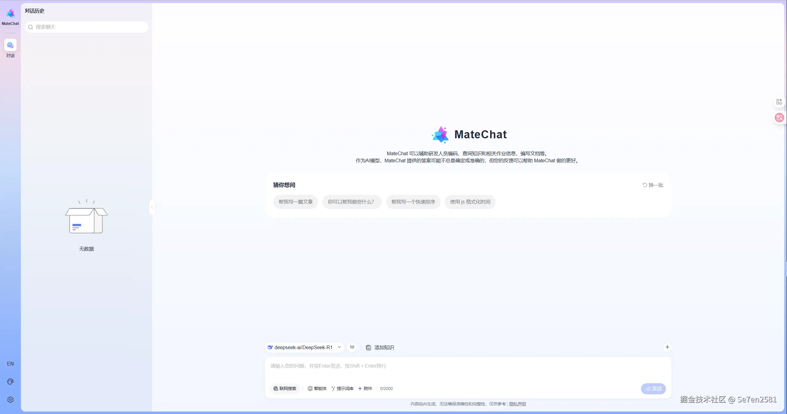 如果要手写这一套,成本太高。直到我发现了 华为云 DevUI MateChat(以下简称 MateChat),它提供了开箱即用的 AI 对话 UI 组件,几乎完美治愈了我"前端恐惧症。