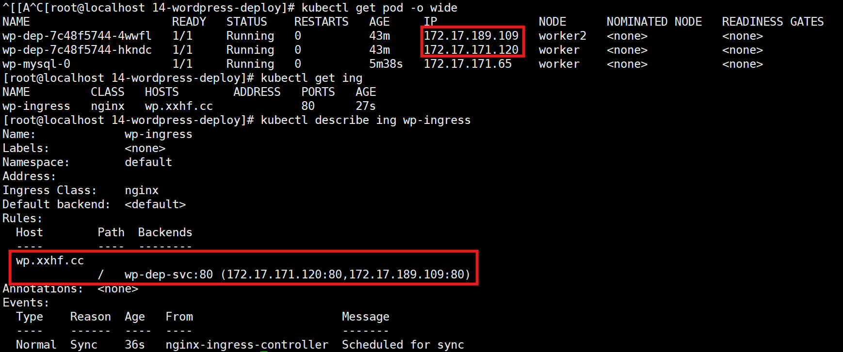 wp-dep-7c48f5744-4wwfl 1/1 Running 0 68m 172.17.189.109 worker2 <none> <none>