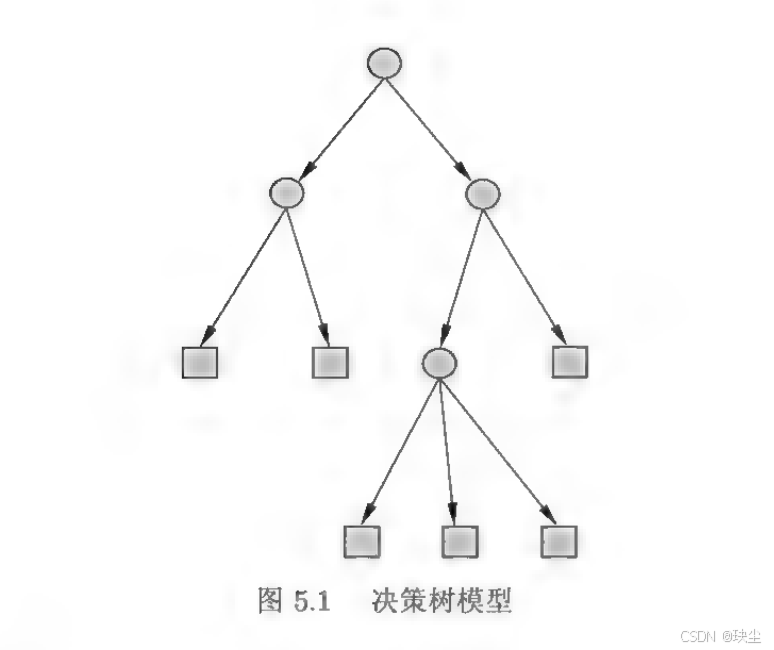 分类决策树模型是一种描述对实例进行分类的树形结构。这种结构由结点和有向边组成,其中结点分为两类:椭圆形的内部结点代表特征或属性,矩形的叶结点代表类别。最上面的结点称为根结点,所有的分类判断都从这里开始。