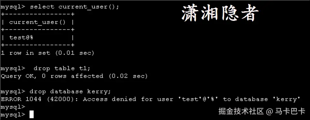 此时,账号test就没有删除数据库kerry的权限了. 当然,你的先退出然后登录(如果之前test账号没有退出一直连接数据库的话)