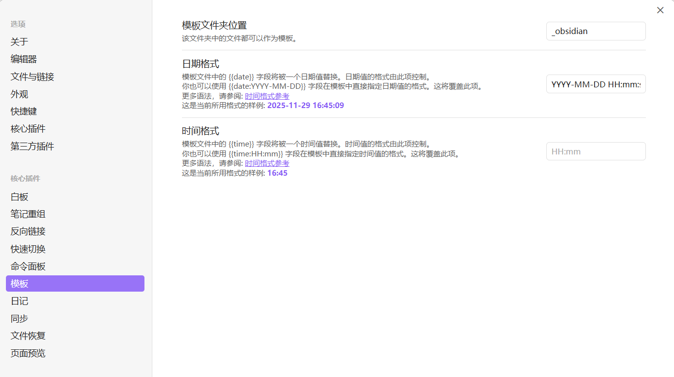 然后进入到 Obsidian 的设置面板,选择『核心插件』,并启用『模板』功能。同时点击旁边的配置按钮,进入到模板配置的设置中,将配置信息设置为: