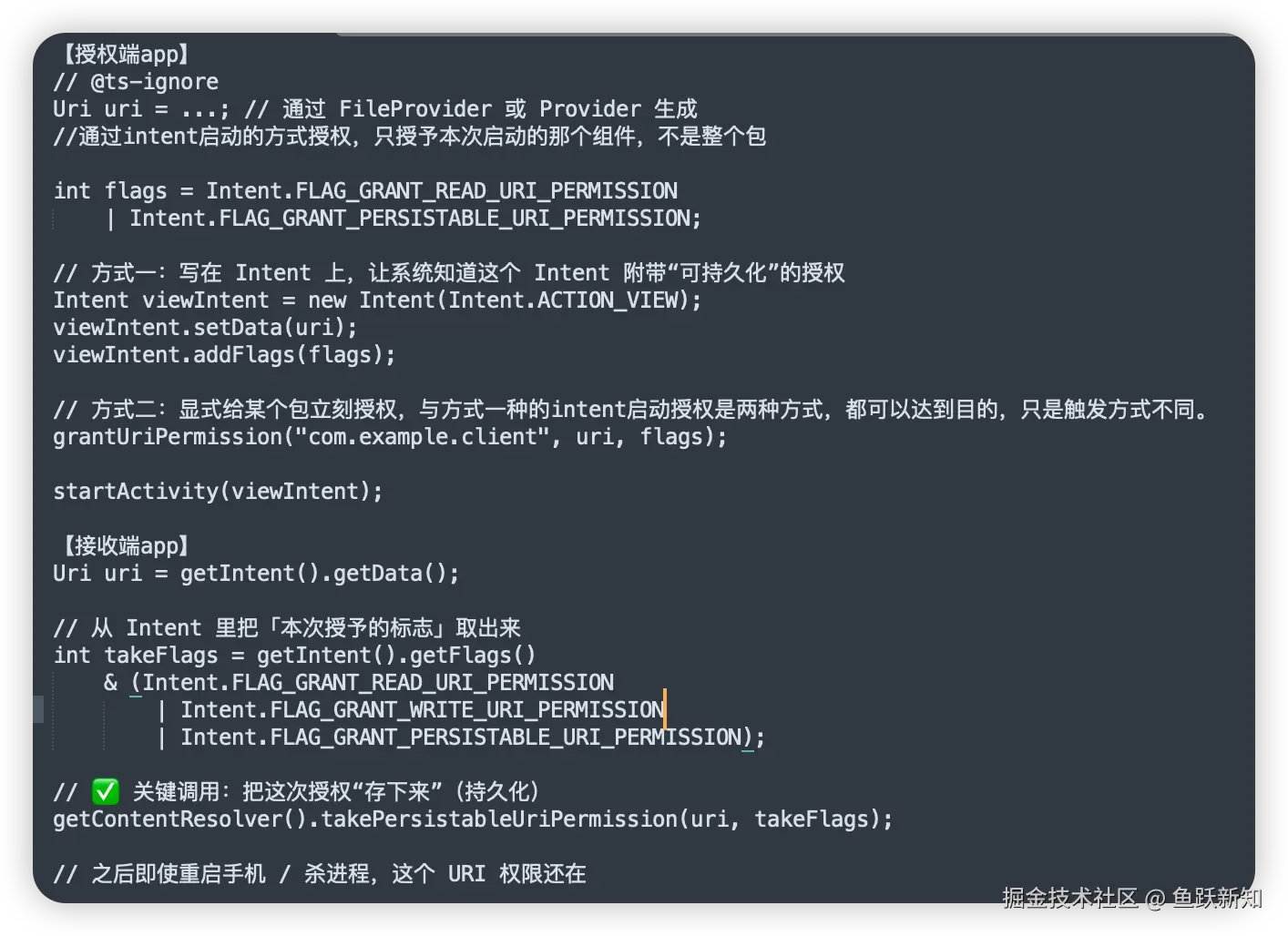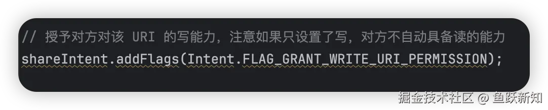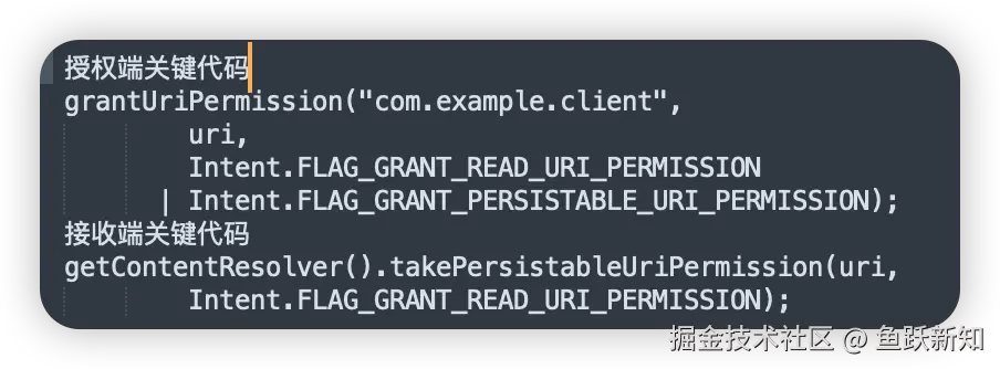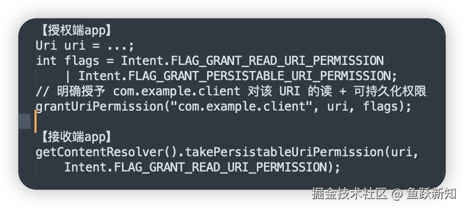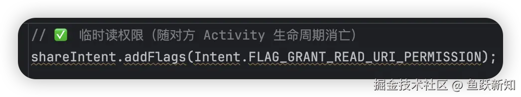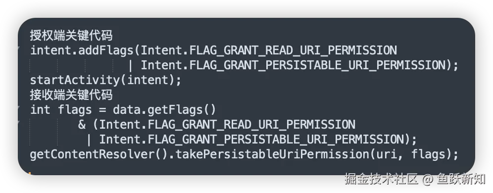 差异点:Intent 授权仅对单个组件生效,而 grantUriPermission() 会让整个 App 获取权限,风险更高