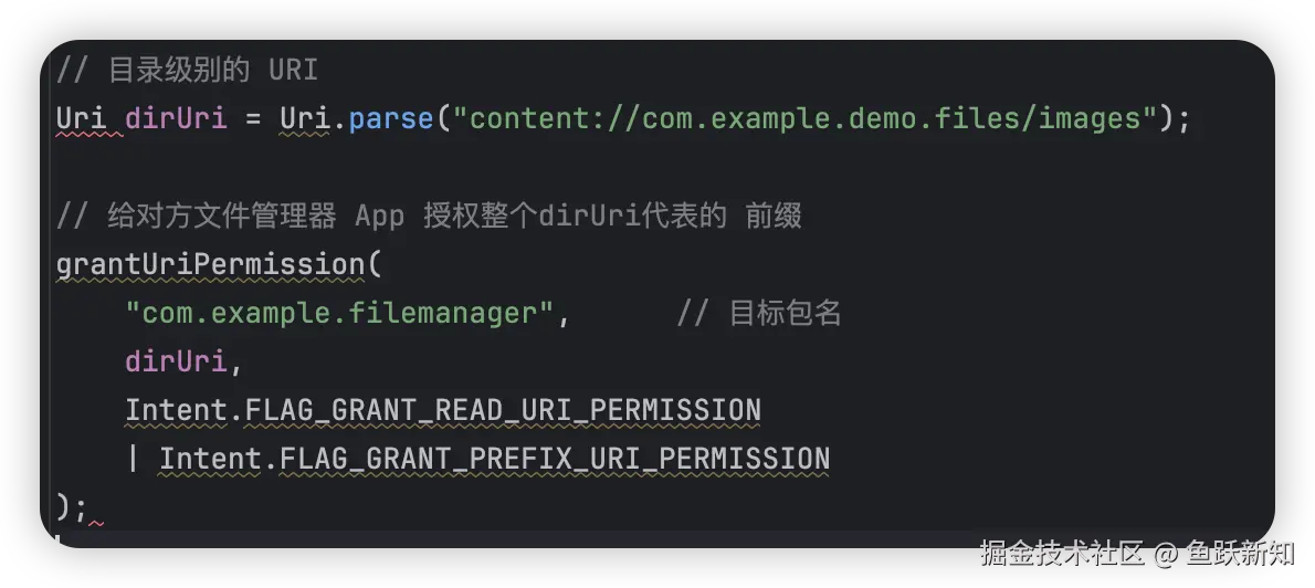 - 系统立即将对应 URI 权限授予 整个包 ,无需启动组件 - 支持前缀 / 持久化等所有 flag 组合 - 适合"后台授予",无需用户交互 - 若希望持久化必须由对方主动调用 takePersistableUriPermission() |