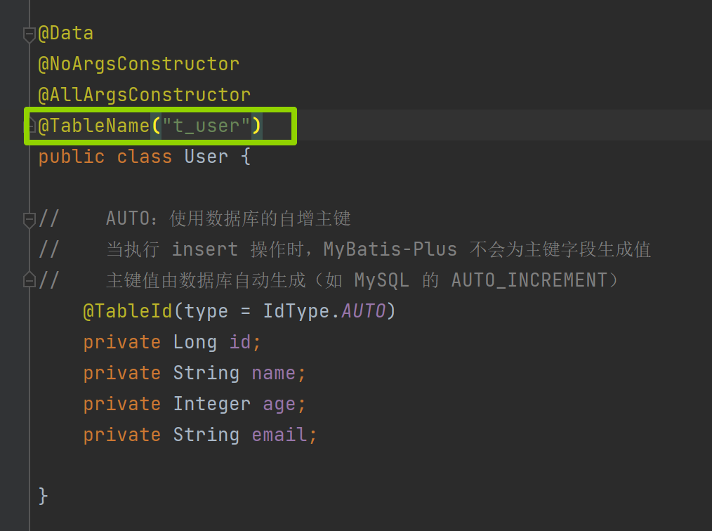 我们在使用MyBatis-Plus实现基本的CRUD时,我们并没有指定要操作的表,只是在 Mapper接口继承BaseMapper时,设置了泛型User,而操作的表为user表 所以MyBatis-Plus在确定操作的表时,由BaseMapper的泛型决定,即实体类型决定,且默认操作的表名和实体类型的类名一致