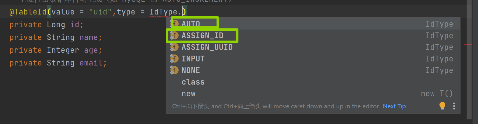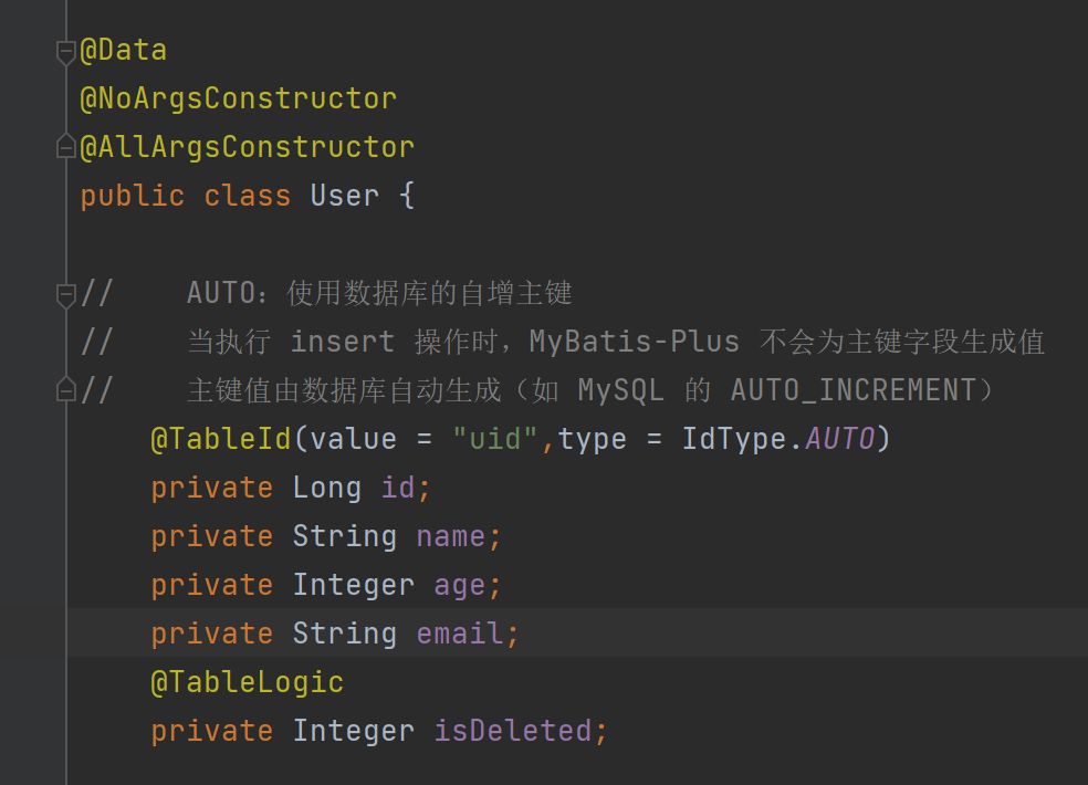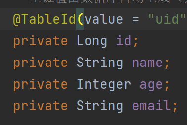 假如我们实体类的id命名和数据库中的并不一致,我们可以在实体类当中的id声明上一行写上数据库id,假如数据库id名称是uid,实体类里面的id名称是id: