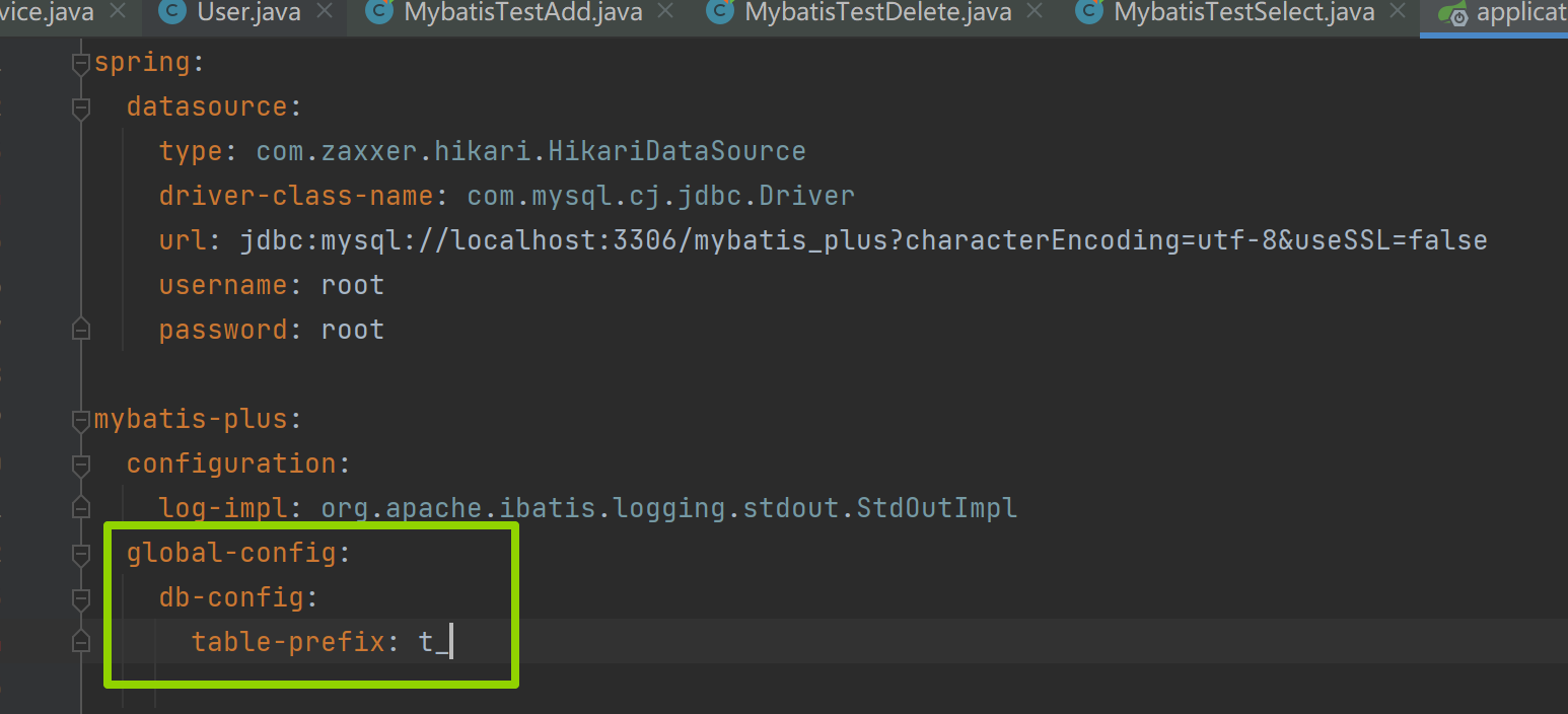 把User实体类上面的@TableName注解去掉,随后在yaml配置文件中配置统一前缀