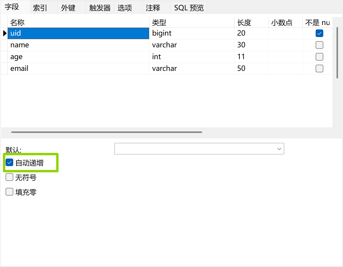 在使用自增的时候要保证数据库当中的自动递增是打开的,否则会报错: