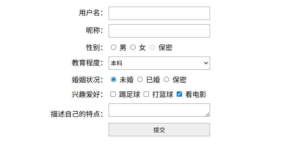 要求:像"用户名、昵称"这些采用标签包裹文本,而'男、女'这些单选框和多相框采用标签包裹文本。