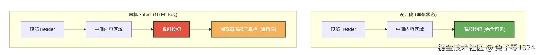 (图解:左侧是理想设计,按钮在最底部;右侧是 Safari 现状,浏览器工具栏无情地盖住了你的按钮)
