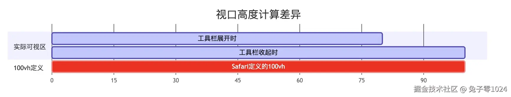 (图解:无论你的工具栏是否展开,Safari 始终认为 100vh 是那个「最大值」。这就导致当工具栏展开(实际只有 80% 高度)时,你的 100vh 内容溢出了 20%。)