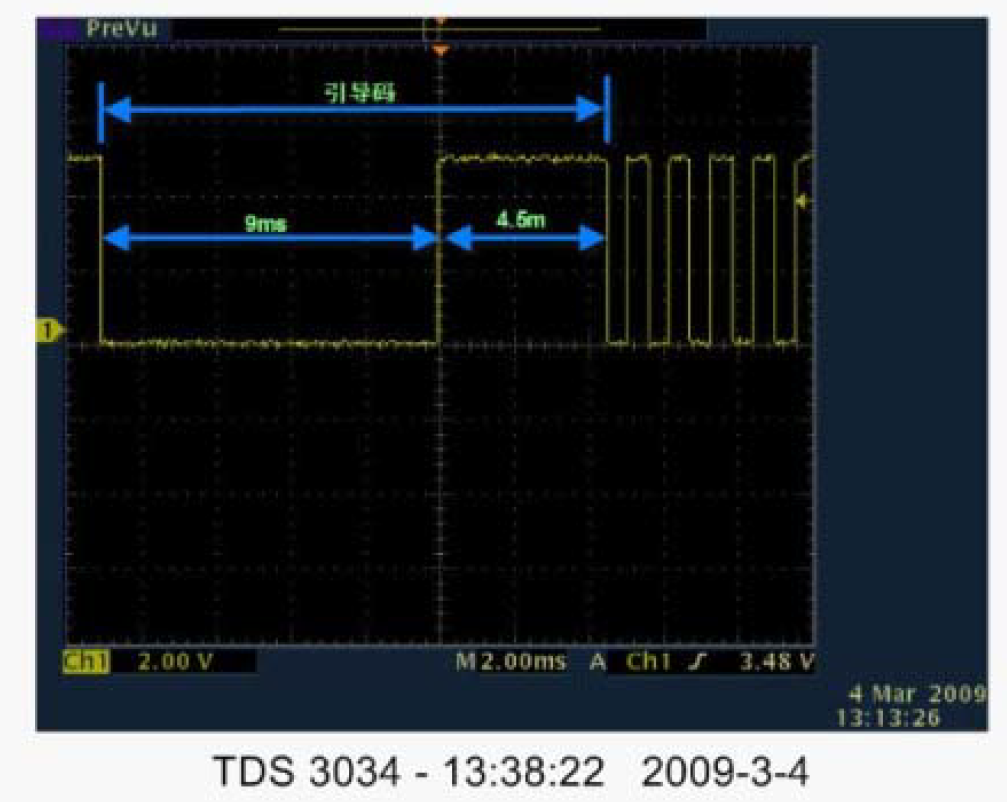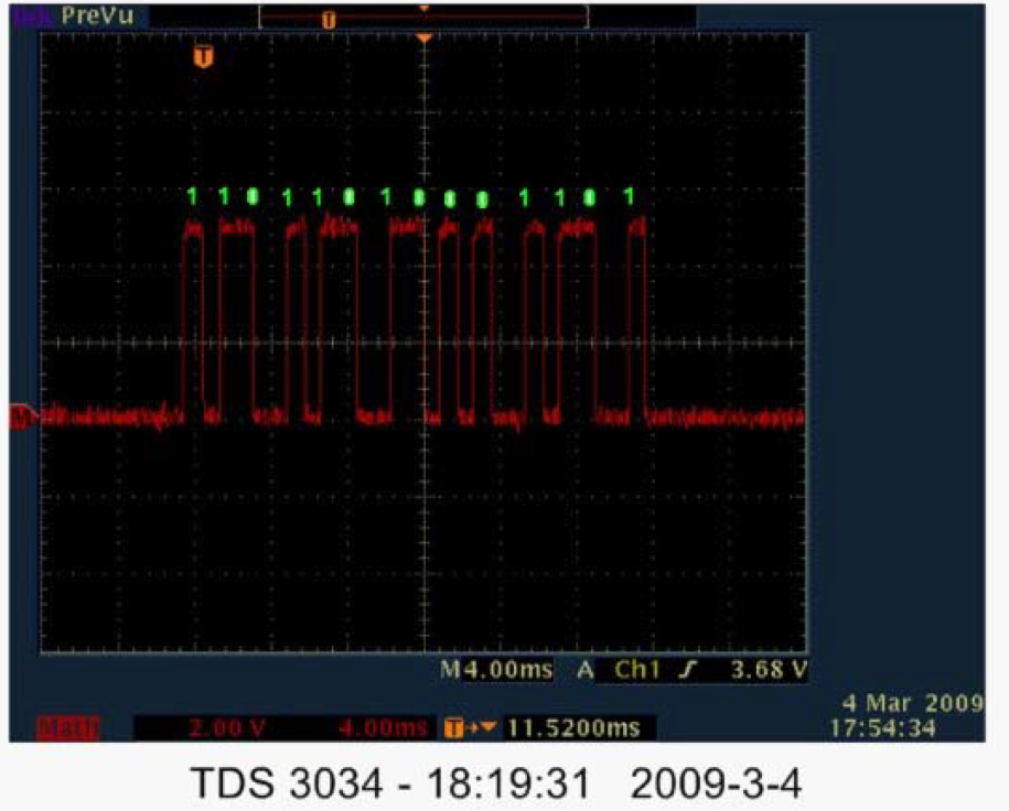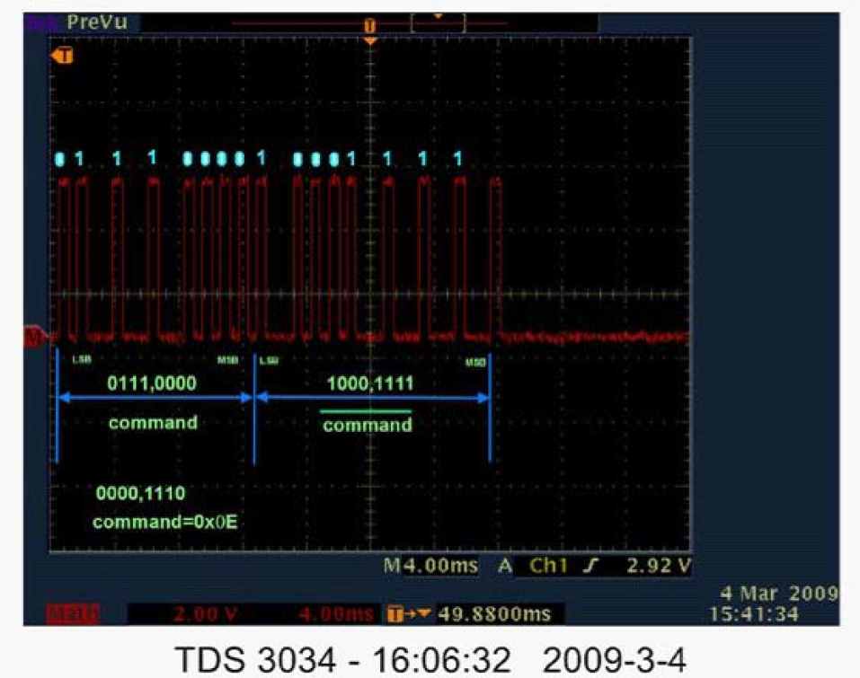 但并不是所有的编码器都是如此,比如TOSHIBA 的TC9012,其引导码为载波发射4.5ms,不发射4.5ms,其"0"为载波发射0.52ms,不发射0.52ms,其"1"为载波发射0.52ms,不发射1.04ms。