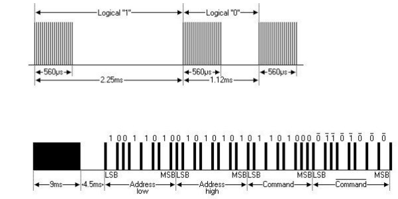 NEC 协议通过脉冲串之间的时间间隔来实现信号的调制(英文简写PPM)。逻辑"0"是由0.56ms的38KHZ 载波和0.560ms 的无载波间隔组成;逻辑"1"是由0.56ms 的38KHZ 载波和1.68ms 的无载波间隔组成;结束位是0.56ms 的38K 载波。