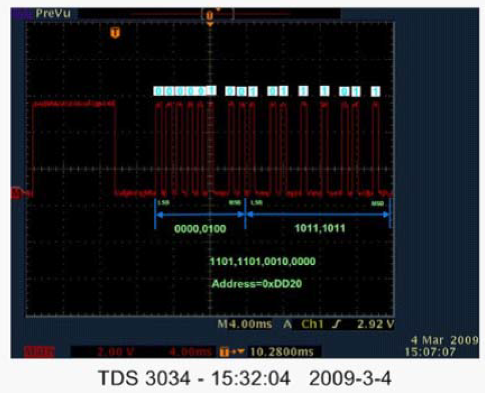 注意波形先是发低位地址再发高位地址。所以0000,0100,1011,1011 反转过来就是1101,1101,0010,000 十六进制的DD20;