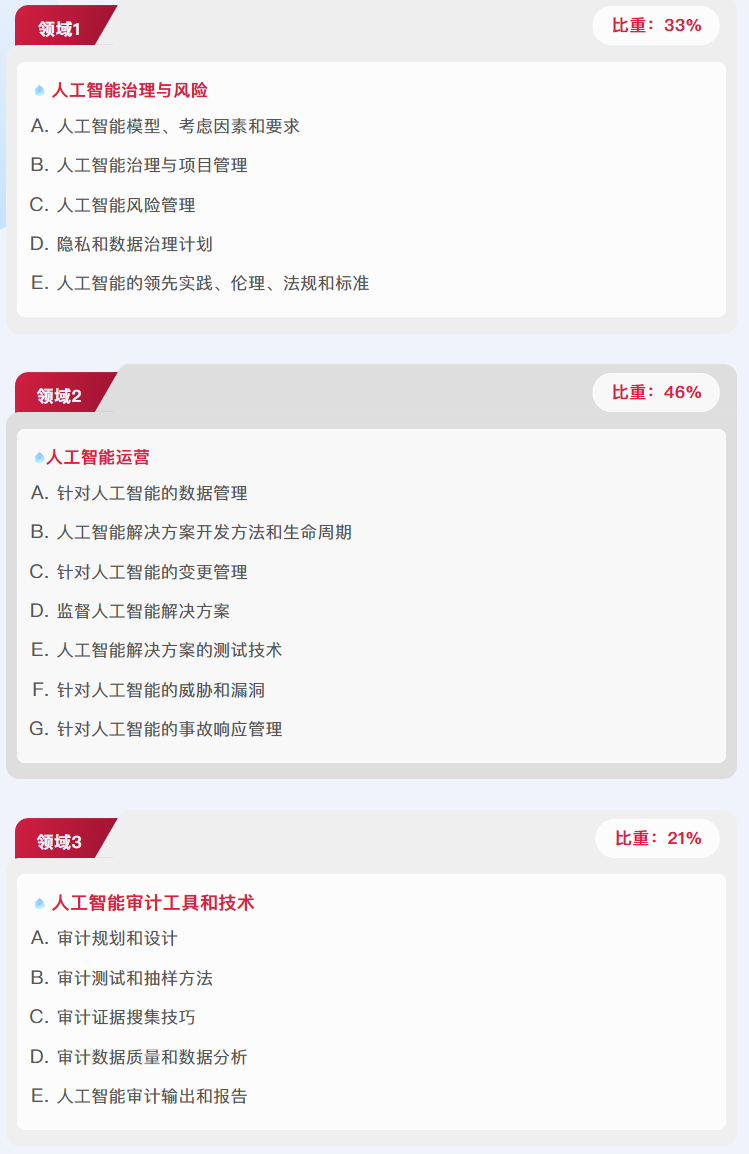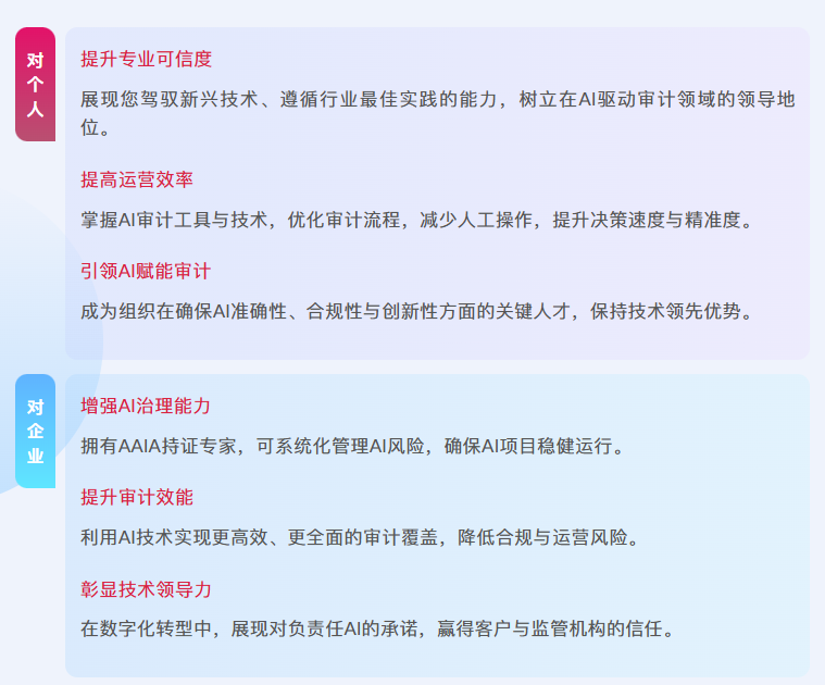 人工智能审计专家(AAIA)认证是专为审计与安全专业人士设计的认证,旨在赋能您具备评估、审计和控制人工智能技术与系统的能力。它不仅是您个人能力的证明,更是您成为组织内"AI信任基石"的通行证。