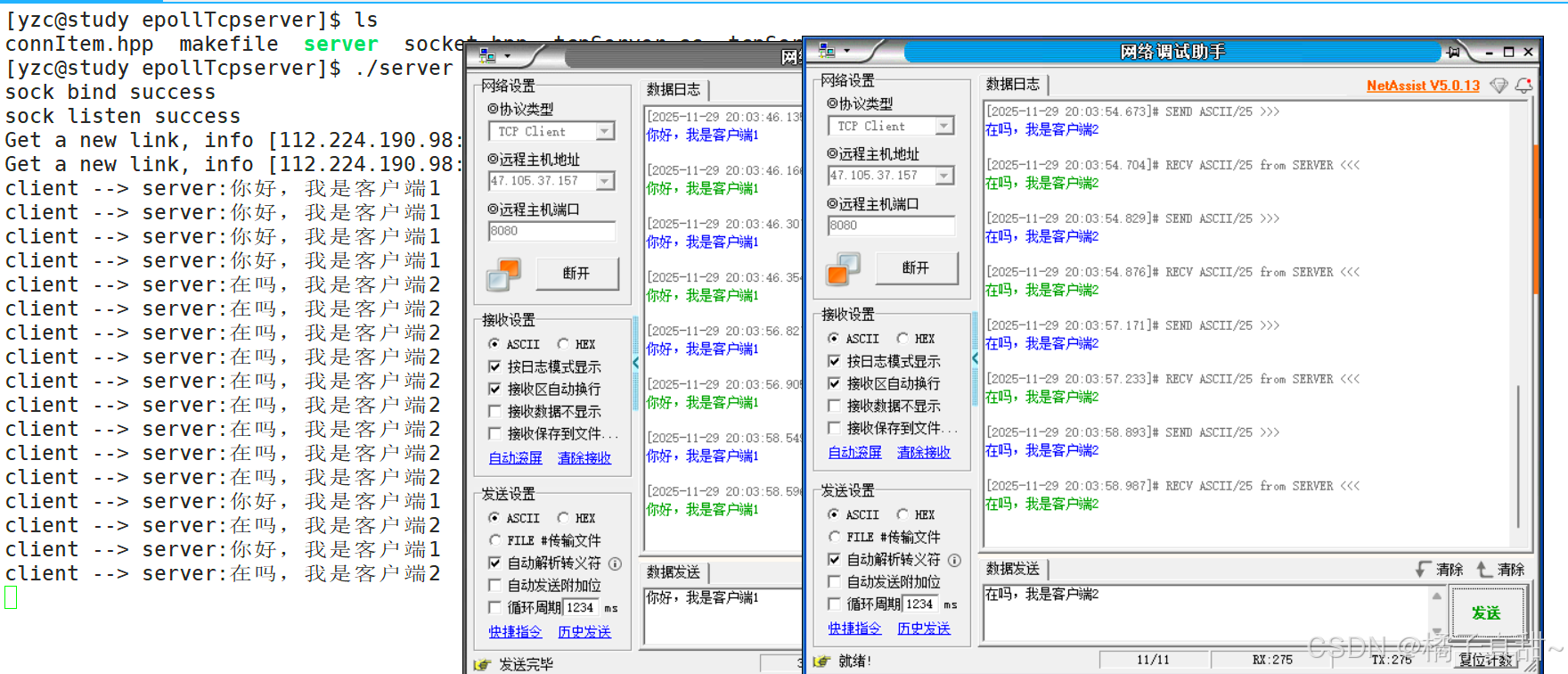 测试通信结果如下,可以看到能够正常处理多个客户端的并发请求。