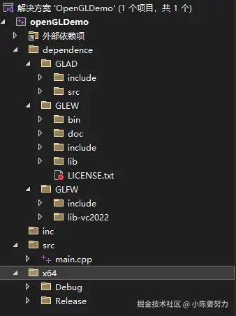 本文档将介绍如何在 Visual Studio 中配置 GLEW / GLFW / GLAD / OpenGL 等开发环境,包括:
