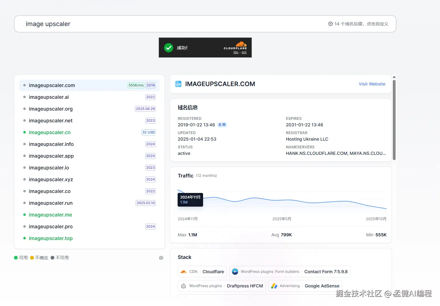 在 queryDomain 上可以看到,这个关键词域名基本上都是被抢光了的,img upsacler 也是一样: