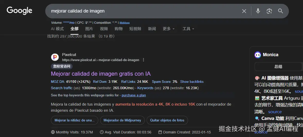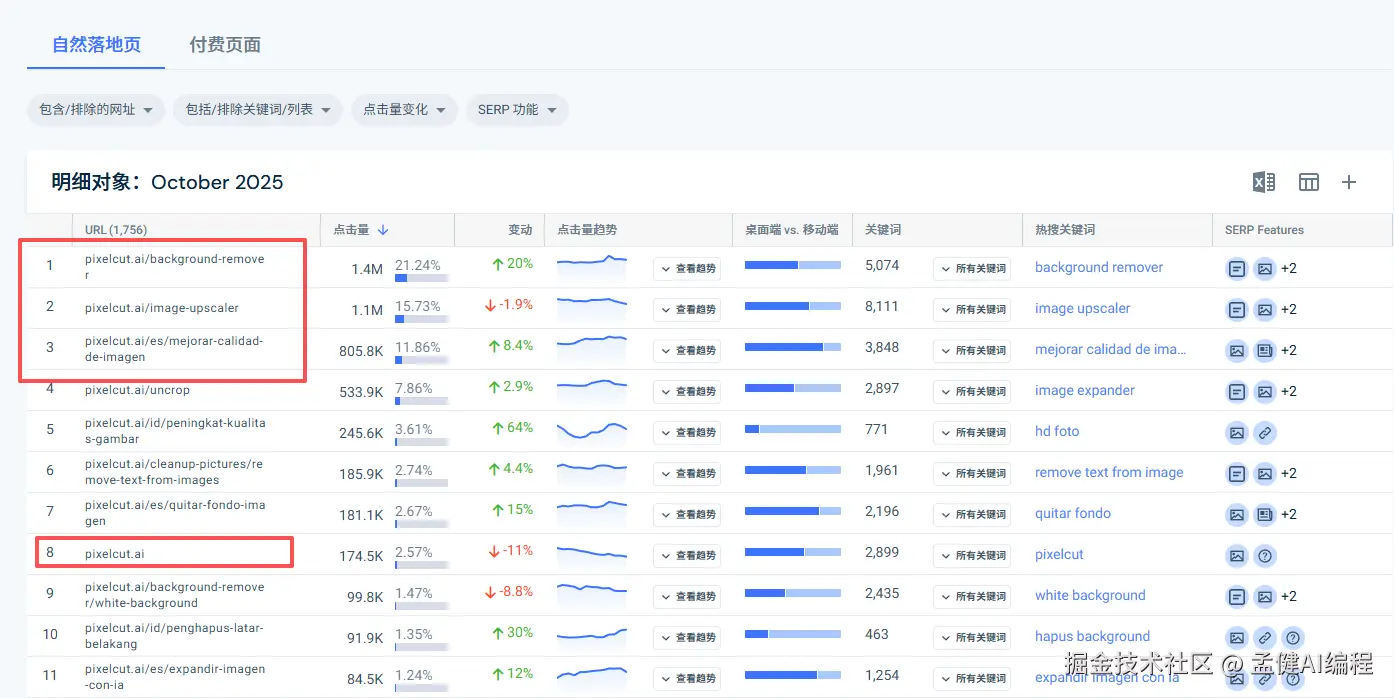 然后我们可以看到,占掉它流量第二大头的搜索词是一个西班牙语,这个词在我的 serp 里,pixelcut 是排第一的: