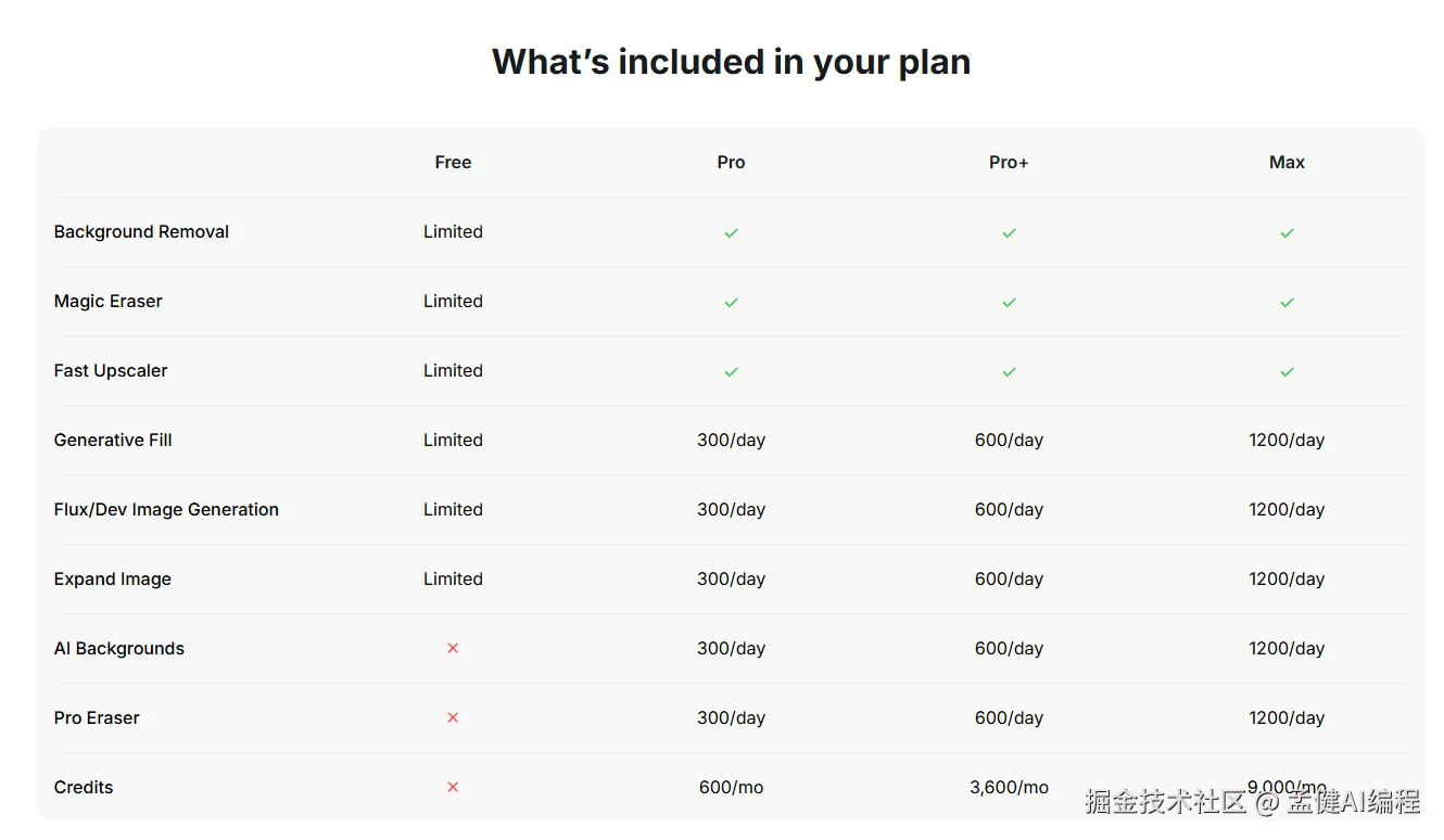 说回这个 Pricing 页面,我觉得值得我们学习的是它用表格的方式列出了不同分级的权益,这也是 Pricing 页面的常用手段,对比会非常清晰。