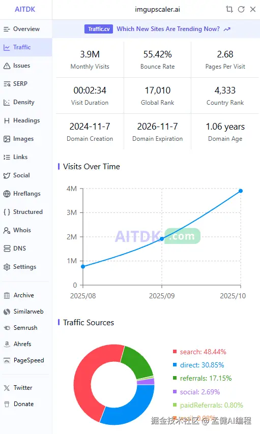 而且,imgupscaler.ai 这个是 2024 年底注册的域名,它目前的访问量已经 400 万了!