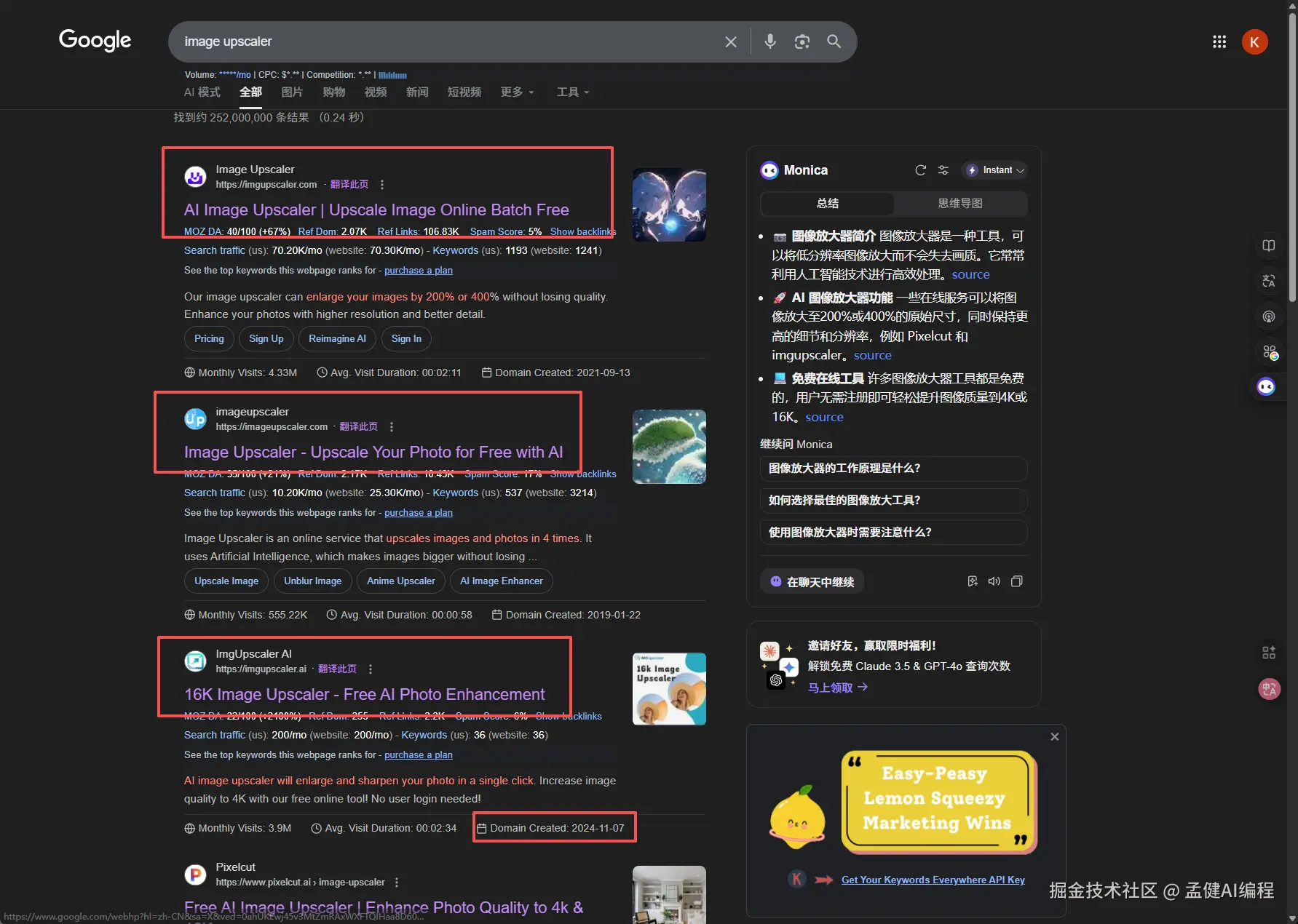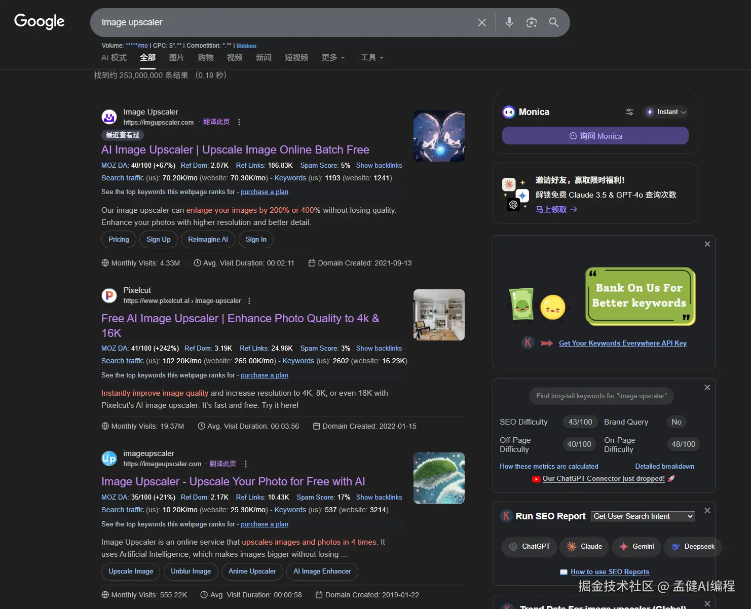这里我想特别说明一下 image upscaler 这个词,它太有代表性了。在我的 serp 里,排前三的都是关键词域名: