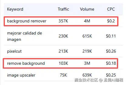 足以说明这个市场实在太大了,这两个词加起来都有七百万的搜索量,remove.bg 不可能把所有词的流量全部吃完,那就给了 pixelcut 的机会。