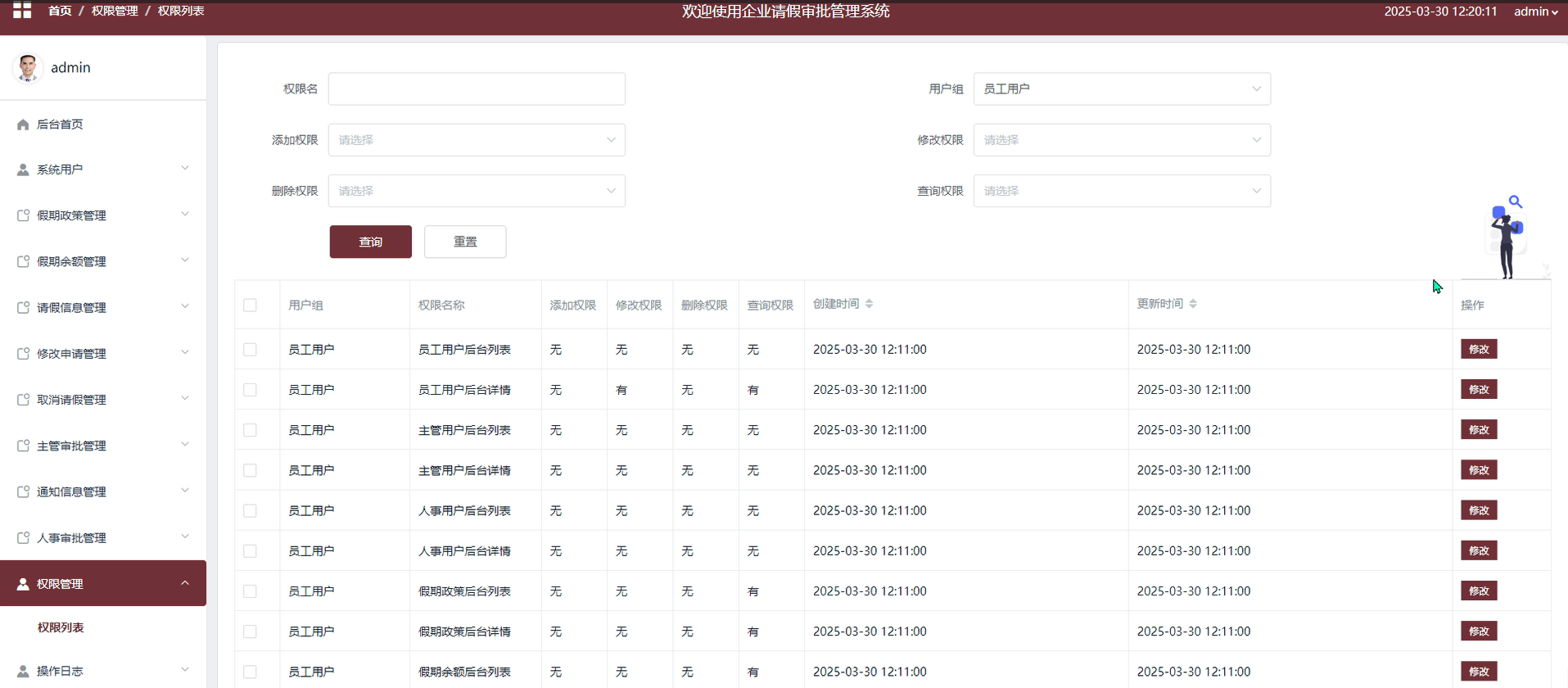 - 数据管理:请假数据自动归档、支持多条件查询导出、假期余额自动计算更新(关联请假审批结果)。