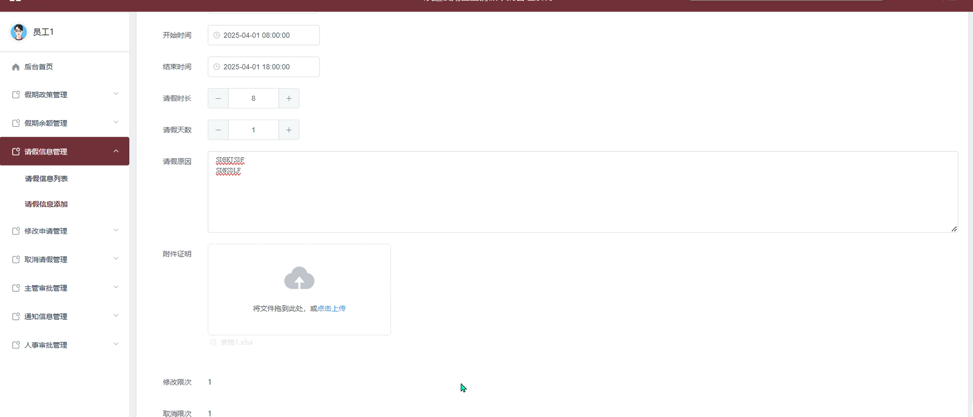 - 员工:注册登录、个人信息修改、请假申请(选择类型、填写时间 / 原因 / 附件)、审批进度跟踪、历史请假记录查询、假期余额查看。